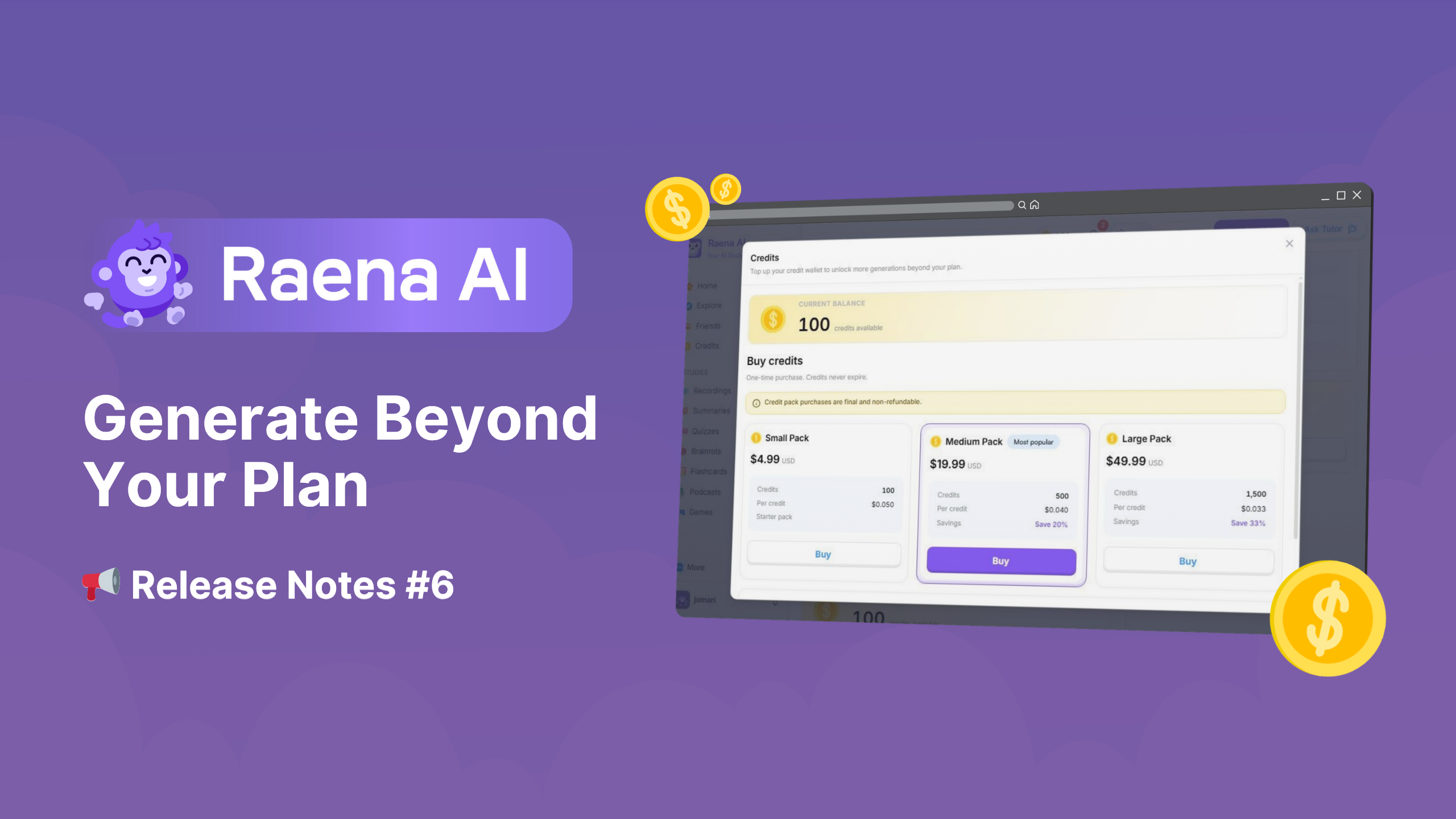 You can now purchase credits on Raena AI to unlock more generations when you hit your plan's monthly limit, no plan upgrade needed!